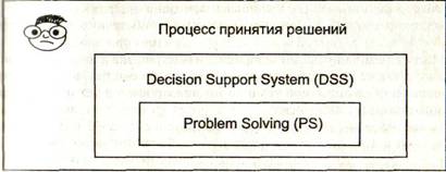 Процессы принятия решений Процессы принятия управленческих решений относятся к категории интеллектуальных процессов, непременным участником которых является носитель естественного интеллекта — человек. С другой стороны, информатика поиска управленческих решений — одно из направлений искусственного интеллекта — связана с использованием новых информационных технологий и компьютерных моделей, выполняющих роль «советчика» в процессе принятия решений. Развитие таких технологий показывает, что подобный симбиоз естественного и искусственного не только все чаще используется в управленческой деятельности, но и в отдельных случаях является необходимым для принятия решения. Если естественный интеллект связан в первую очередь с интуицией и искусством принятия решений, то искусственный обладает особыми качествами, не свойственными человеку. Это в первую очередь способность анализа большого количества вариантов решения и выбора наилучшего в том или ином смысле. В сфере информационных технологий хорошо известен класс систем поддержки принятия решений (Decision Support System — DSS). Системы этого класса основаны на использовании так называемых решателей задач (Problem Solvers — PS) — пакетов программ, способных решить прикладную задачу. В этом контексте общая структура процесса принятия решения может быть проиллюстрирована рис. 1.1, отражающим вложенности сред принятия решений. Верхний уровень (собственно принятия решений) — уровень взаимодействия лица, принимающего решение (ЛПР), со средой DSS, которая в свою очередь использует среду PS. Интерактивность взаимодействий предлагает ЛПР наиболее подходящий и со всех сторон «просчитанный» вариант решения.