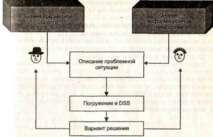 Основными научными направлениями, определяющими методологию, а также концептуальные и реализационные основы соответствующей информационной технологии поддержки принятия управлен-ческих решений, являются: • математическое программирование; • имитационное моделирование; • эвристическое программирование. Первые два хорошо известны, они определяют содержание основных разделов исследования операций — науки о математических и алгоритмических основах процессов принятия решений [1]. Эвристическое программирование как научное направление сложилось сравнительно недавно и на текущий момент рассматривается как один из разделов искусственного интеллекта, включающий в себя генетические алгоритмы, нечеткую логику, новые методы поиска (метод отжига, поиск с запретами) и т. д. Решение любой задачи поиска с помощью DSS-технологий требует формального описания проблемной ситуации. Такое описание выполняется с использованием формальных понятий, составляющих основу информационной технологии. Например, в электронных таблицах такими понятиями являются: клеточная формула, изменяемая ячейка, граф зависимостей и т. п. Составить описание проблемной ситуации с использованием этих и им подобных понятий не всегда просто. Иногда для этого не хватает знаний в области информационной технологии, иногда в предметной области, а иногда даже при наличии таких знаний не удается установить адекватное соответствие между проблемной ситуацией и формальной моделью. В этом заключается проблема априорной неопределенности. Ситуация усугубляется еще и тем, что составление описания проблемной ситуации требует использования двух областей знаний: предметной области и формальной (собственно информационной технологии). Как правило, носителями этих знаний являются люди разных специальностей: менеджеры с одной стороны и системные аналитики, программисты, математики с другой стороны, поэтому формализация проблемы требует выработки общего понимания, общего языка для описания ситуации. Рисунок 1.2 иллюстрирует процесс взаимодействия носителей различных знаний — лиц, участвующих в составлении формальных описаний проблемной ситуации. Разумеется, что в общем случае круг таких лиц может расширяться, при этом взаимодействие между ними в среде DSS определяет новый круг вопросов инженерии знаний.