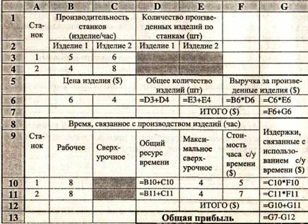 Задачи определения объемов производства товаров и услуг Для этих задач целевая ячейка обычно определяет объем реализации некоторой разнородной продукции в стоимостном выражении. Целью оптимизации является определение оптимального соотношения объемов между видами выпускаемой продукции, при котором объем реализации достигает максимума. Требуется определить объемы производства изделий каждого вида и уровень использования сверхурочного времени на каждом из станков, обеспечивающие получение максимальной прибыли.