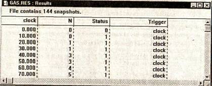 На рис. 2.13 представлен фрагмент файла GAS.RES, в котором собрана коллекция Gas (рис. 2.10), а на рис. 2.14 — фрагмент файла EXAMPLE 1.QUE, в котором собрана информация о состоянии очередей в течение прогона программы модели. Файл рис. 2.13 содержит 4 поля, из них 3 хранят значения переменных коллекции, собранных через интервал в 10 ед. времени, а поле Trigger информирует нас об условии сбора данных (см. рис. 2.10, 2.11). Файл в целом содержит 144 записи о значениях переменных] коллекции Gas. (Термин Snapshot определяет как бы моментальный! снимок, фотографию, на которой запечатлено состояние модели, за-фиксированное в определенный момент времени.) Файл рис. 2.14 содержит 6 полей: 1. Clock (момент времени, в который изменилось состояние очереди);