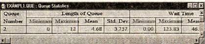 Первая запись файла EXAMPLE.QUE говорит о том, что в начальный момент времени тэг с номером 0 вошел в очередь нулевой длины и тут же вышел из нее (в блок 2), вторая свидетельствует о проходе тэга 1 через пустую очередь. Тэг с номером 2 вошел в пустую очередь и простоял в ней (в одиночестве) 3.476 ед. времени в связи с занятостью блока 2 (заправка автомобиля — тэга с номером 1). Аналогично поведение тэгов с номерами 3 и 4. Всего за весь сеанс моделирования система зарегистрировала 259 изменений в очереди Анализ результатов эксперимента Результаты эксперимента могут быть проанализированы с использованием методов, инкапсулированных в меню Анализ (Analyze). Эти методы позволяют представить результаты прогона модели в наглядной лаконичной форме графика или таблицы. Использование методов анализа призвано способствовать выявлению «узких мест» в организации исследуемой системы и принятию управленческих решений по реорганизации бизнес-процессов. Статистика очереди Файлы результатов с расширением QUE анализируются методами «Статистика очереди» (Queue Statistics) и «Графы очереди» (Queue Graphs). Для вызова этих методов необходимо открыть соответствующий файл (сделать окно с файлом активным) и выбрать в меню нужный вам метод. Вызов метода «Статистика очереди» для файла EXAMPLE1.QUE приведет к выводу таблицы рис. 2.15. В этой таблице для очереди 2 примера 1 представлены характеристики длины очереди (Length of Queue) и времени пребывания тэга в очереди (Wait Time) (Mean — среднее значение, Std.Def. — Standart Deviation — среднеквадратичное отклонение для каждой из характеристик).