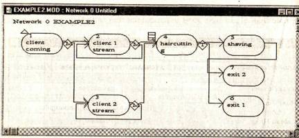 сти, а в поле Ending Effect размещается оператор освобождения парикмахера. В нашем примере он может быть освобожден, если завершилось обслуживание клиента первого типа, если же стригся клиент второго типа, то его обслуживание должно быть продолжено (в блоке 5 — shaving), и следовательно парикмахер не может быть освобожден. В соответствии с этим содержанием в поле Ending Effect блока 4 размещается оператор: if client_type[tag]= =1 then St:= 0;. Клиент, выходящий из четвертого блока, направляется в пятый при выполнении условия: client_type[tag]= =2; и направляется в шестой при выполнении условия client_type[tag]= =1. Эти условия размещаются в разветвителе, стоящем на выходе пятого блока. Соответственно в поле Ending Effect блока 5 размещается оператор освобождения парикмахера: St:= 0;. В остальном эта модель мало чем отличается от модели примера 1. Задача как накопитель тэгов В общем случае в блоке задачи могут одновременно находиться несколько тэгов. Как правило, это происходит тогда, когда задача имитирует механизм обслуживания нескольких клиентов. В таких случаях задача превращается в своеобразный накопитель тэгов. Date: 2015-07-23; view: 344; Нарушение авторских прав |