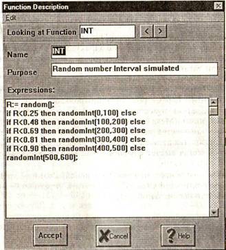 Использование функций повышает лаконичность и наглядность описания модели. Пример 5. Имитация случайных величин, заданных эмпирическим распределением (таблицей) В качестве примера описания в окне рис. 2.25 мы использовали функцию датчика случайных чисел, определенных эмпирическим законом распределения вероятностей. Такой закон обычно задается таблицей. Здесь приведен пример такой таблицы и краткий комментарий к составлению алгоритма вычисления функции INT.