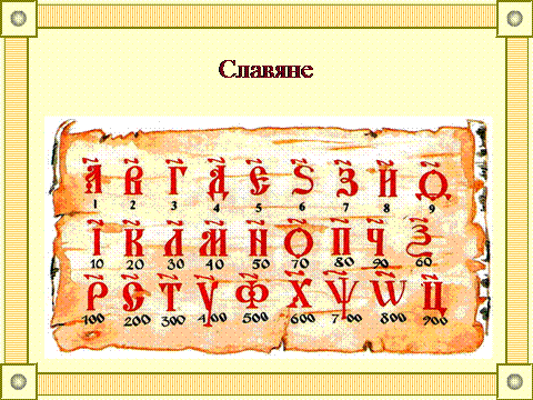 Предки русского народа – славяне - для обозначения чисел также употребляли буквы. Над буквами, употребляемыми для обозначения чисел, ставились специальные знаки – титла. Чтобы отделить такие буквы – числа от текста, спереди и сзади ставились точки. Этот способ обозначения цифр называется цифирью. Он был заимствован славянами от средневековых греков – византийцев. Поэтому цифры обозначались только теми буквами, для которых есть соответствия в греческом алфавите.