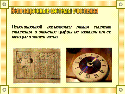 Они похожи на многие наши цифры. Слово «цифра» тоже досталось нам от арабов по наследству. Арабы нуль, или «пусто», называли «сифра». С тех пор и появилось слово «цифра». Правда, сейчас цифрами называются все десять значков для записи чисел, которыми мы пользуемся: 0, 1, 2, 3, 4, 5, 6, 7, 8, 9. От пальцевого счета пошли пятеричная система счисления (одна рука), десятеричная (две руки), двадцатеричная (пальцы рук и ног). В древние времена не существовало единой для всех стран системы счета. Некоторые системы исчисления брали за основу 12, другие – 60, третьи – 20, 2, 5, 8. Шестидесятеричная система исчисления, которую ввели римляне, была распространена по всей Европе вплоть до XVI века. До сих пор римские цифры используют в часах и для оглавления книг. Древние римляне использовали систему исчисления, для отображения цифр в виде букв. Они использовали в своей системе исчисления следующие буквы: I. V. L. C. D. M. Каждая буква имела различное значение, каждая цифра соответствовала номеру положения буквы.