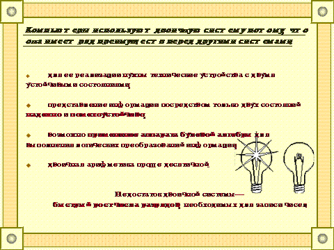Одну и ту же информацию одинаковую по содержанию можно представить в различных формах. Например, чувство влюбленности поэт, художник, музыкант и хореограф представляют по-разному, в удобной для них форме. Форма представления информации зависит от цели её использования. Выделяют следующие формы представления информации: 1) знаково-письменная (символьная графическая табличная); 2) жесты и сигналы; 3) устно-словесная. Независимо от формы представления и способа передачи информации, она всегда представляется с помощью какого-либо языка. Языки делят на естественные (разговорные) и формальные (применяемые в специфических областях). Основу любого языка составляет алфавит - набор однозначно определенных символов из которых формируется сообщение. Код - набор символов, для представления информации (алфавит языка). Представление информации с помощью какого-либо языка часто называют кодированием. Кодирование – это процесс представления информации в виде кода. Т.е. преобразование информации из удобной для непосредственного использования в удобную для передачи, хранения или автоматической обработки. Существует множество способов кодирования информации. Это и азбука Морзе, появившаяся в 19 в. (набор символов – точка, тире, пробел), и флажковая система, и магнитные полоски и штрих-коды на каждом товаре в супермаркете. В 1703г. великий немецкий математик Лейбниц предложенная еще в 17в. уникальная и простая система представления информации с помощью всего двух символов 0 и 1. 1936 – 1938гг. – американский инженер и математик Клод Шеннон предложил использовать двоичную систему счисления для конструирования электрических схем. Все фантастические возможности вычислительной техники реализуются путем создания разнообразных комбинаций сигналов высокого и низкого уровней. "Единица" условно обозначает включенное состояние, а "нуль" - выключенное состояние. У древних людей, кроме каменного топора и шкуры вместо одежды, ничего не было, поэтому считать им было нечего. Постепенно они стали приручать скот, возделывать поля и собирать урожай; появилась торговля, и тут уж без счета никак не обойтись.