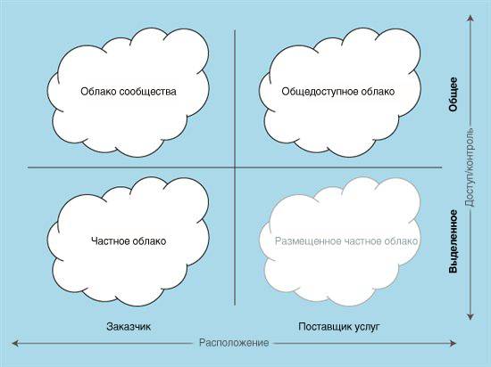 Для классификации различных моделей развертывания облачных вычислений используются два измерения.