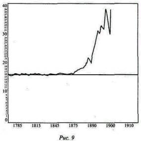Странно, что уроки Франции и другие эксперименты, кажется, не были вообще поняты ни монометаллистами, ни биметаллистами. Например, непримиримые монометаллисты указывали на колебания ценности золота и серебра в течение трех четвертей столетия как на довод, опровергающий возможность поддержания законного соотношения между ценностями обоих металлов. Они могли бы с таким же успехом указывать на рябь пруда или на легкое течение реки как на доводы, опровергающие тот факт, что вода стремится к определенному уровню. Эта рябь в действительности обнаруживает процесс стремления к определенному уровню и является ничтожной по сравнению с теми колебаниями, которые, по всей вероятности, имели бы место, если бы не существовало законного соотношения. Диаграмма и таблицы, приведенные Шоу в его “Истории денежного обращения”, и подобная же диаграмма, приводимая нами, показывают, что в течение периода наплыва серебра с 1803 по 1850 г., вопреки значительному увеличению количества серебра соотношение 15%: 1 увеличилось maximum только на 0,75 пункта, или немного больше чем 4,8% в среднем в год, и среднее отклонение составляло только 0,29 пункта, или 1,9%. Кроме того, большая часть отклонений объясняется пошлиной за чеканку, которая в то время существовала во Франции [См.: Johnson J. F. Money and Currency. Boston (Ginn), 1905. P. 227.]. В течение последующего периода, от 1851 до 1870 г., характеризуемого значительным притоком золота, максимальное отклонение (в обратном направлении) было 0,31 пункта, или 2%, при среднем отклонении 0,14 пункта, или 0,9%; в период от 1871 по 1873 г., характеризуемый притоком серебра и отливом золота, соотношение 15%: 1 увеличилось на 0,42 пункта, или на 2,7%, при среднем отклонении на 0,21 пункта, или 1,4% [Хотя Франция не прекращала совершенно до 1876 г. чеканку серебряных пятифранковых монет, однако ограничения начались с 1874 г.]. Сопоставим эти цифры с цифрами для позднейшего периода начиная с 1873 г.. Максимальное отклонение от соотношения 15%: 1 после 1873 г. достигало 23,65 пункта, или 152,6%, при среднем отклонении 10,4, или 67,1% [Эти цифры взяты из докладов директора Монетного двора.]. История соотношения показана на рис. 9.
