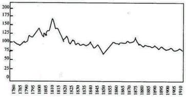 В течение последнего столетия колебания цен регистрировались более тщательно, и они обнаруживают много подъемов и падений. Наиболее полные статистические данные имеются для Англии. Они изображены на диаграмме. Как всем хорошо известно, цены в Англии увеличились с выпуском неразменных бумажных денег в течение наполеоновских войн. Этот период бумажно-денежного обращения существовал с 1801 по 1820 г. Но цены, выраженные в бумажных деньгах, были очень немного выше цен, выраженных в золоте, и главные движения цен (исключая немногие годы) только в незначительной степени испытали на себе влияние бумажно-денежного обращения. Главные периоды движения цен в Англии начиная с 1789 г. могут быть расположены следующим образом: 1789 - 1809 гг. - цены возрастали, запас денежных металлов увеличивался. 1809 - 1849 гг. - цены падали, запас не изменялся. 1849 - 1873 гг. - цены возрастали, запас увеличивался. 1873 - 1896 гг. - цены падали, запас увеличивался слабо. 1896 г. и до настоящего времени - цены возрастали, запас увеличивался.