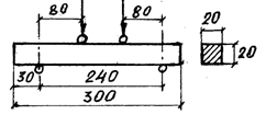 где: N – максимальная разрушающая нагрузка, кгс; l – расстояние между опорами, см; b и h – ширина и высота образца, см. Испытание проводится на стандартных образцах без видимых пороков длиной 300 мм, сечением 20х20 мм при нагружении двумя симметричными нагрузками по схеме: