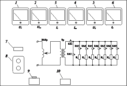 Рисунок 10 – Лицевая панель лабораторного стенда 1 – вольтметр, измеряющий напряжение первичной обмотки; 2 – вольтметр, измеряющий напряжение первичной обмотки в режиме короткого замыкания; 3 – амперметр, измеряющий ток первичной обмотки; 4 – миллиамперметр, измеряющий ток первичной обмотки в режиме холостого хода; 5 – вольтметр, измеряющий напряжение на вторичной обмотке; 6 – амперметр, измеряющий ток во вторичной обмотке; 7 – лампа, сигнализирующая наличие питания на входной части стенда; 8 – кнопка включения/включения стенда; 9 – лабораторный автотрансформатор; 10 – стационарный ваттметр.