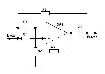При выборе резисторов надо учесть, что их номиналы должны лежать в пределах 10-100 кОм, поскольку выходное сопротивление фильтра растет вместе с частотой и если номиналы резисторов выходят за вышеуказанные рамки это может сказаться на работе фильтра. Отрицательно, разумеется - иначе зачем предупреждать? Фильтр Низких Частот (ФНЧ, Low-Pass - как угодно)