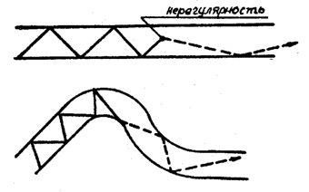 Рис.1. Типы волн в оптическом волокне Однако на практике оптические волокна не прямолинейны и имеют нерегулярности по своей длине. Это обстоятельство приводит к обмену мощностями, переносимыми каждой волной. Обмен мощностями (перераспределение мощностей) между волнами происходит там и тогда, где и когда соответствующие волнам световые лучи падают на нерегулярность (дефект) в сердечнике или изгиб на границе раздела между сердечником и оболочкой (рис.2). Луч, падая на нерегулярность, изменяет угол отражения, что эквивалентно изменению количества световой мощности, которую он переносит. Нерегулярности и изгибы волокна возникают при изготовлении, прокладке и эксплуатации оптических кабелей.