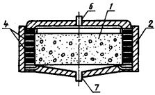 1 - образец бетона; 2 - испытательная обойма; 3 - мастика; 4 - набор резиновых и металлических колец; 5 - резиновая полая камера; 6 - съемная крышка для подачи воды; 7 - съемная крышка с патрубком для сбора фильтрата