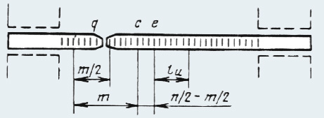 В зависимости от величины начальной расчетной длины образца к букве добавляют индекс. Например, при начальной расчетной длине, равной 5 d, - δ5, при 100 мм - δ100 и т.д. Конечную расчетную длину образца l к, включающую место его разрыва, определяют следующим способом. Перед испытанием образец на длине, больше рабочей длины образца, размечается на n равных частей при помощи меток, наносимых делительной машиной, скобками или керном. Расстояние между метками для арматуры диаметром 10 мм и более не должно превышать величину d и быть кратным 10 мм. Если число интервалов n, соответствующее начальной длине образца, получается дробным, его округляют до целого в большую сторону. После испытания части образца тщательно складывают вместе, располагая их по прямой линии. От места разрыва в одну сторону откладывается n /2 интервалов и ставят метку а. Если величина n /2 оказывается дробной, то ее округляют до целого числа в большую сторону. Участок от места разрыва до первой метки при этом считается как целый интервал. От метки а откладывают в сторону разрыва n интервалов и ставят метку b (рис 6). Отрезок ab равен полученному по месту разрыва конечной расчетной длине l к. Если место разрыва ближе к краю захвата машины чем величина n /2 (рис 7), то полученную после разрыва конечную расчетную длину l к определяют следующим образом: от места разрыва до крайней метки q у захвата определяют число интервалов, которое обозначают т /2. От точки q к месту разрыва откладывают т интервалов и ставят метку с. Затем от метки с откладывают n /2 - т /2 интервалов и ставят метку е. Конечную расчетную длину образца l к, мм, вычисляют по формуле
