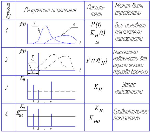 Рис.1.2. Характеристики, получаемые в результате испытания изделия на надежность. Испытания – это экспериментальное определение характеристик двигателя, т.е. уровня надежности, проводимое по специально разработанной программе или плану. 1. Законы распределения сроков службы (наработки) до отказа для каждого из выходных параметров изделия с учетом условий и режимов его работы. Эта характеристика является наиболее полной и позволяет определить все необходимые показатели надежности, и, в первую очередь, вероятность безотказной работы за данный период времени Р (t=Т). Однако получение законов распределения f(t), хотя и является весьма желательным, обычно трудно осуществимо. Оно требует большого статистического материала, который связан с длительными испытаниями и большими материальными затратами. Законы распределения могут быть практически получены лишь для простых изделий или образцов. 2. Случай, когда определены отдельные параметры законов распределения или получены данные, неполно характеризующие эти законы, является типичным результатом испытания на надежность многих объектов. Например, может быть определена вероятность безотказной работы изделия в течение заданного периода времени, но остается неизвестной характеристика безотказности для более длительного периода работы изделия или закон распределения сроков службы и его параметры определены лишь с известной степенью достоверности. По этой ограниченной информации также надо сделать заключение об уровне надежности изделия. 3. Сложность и продолжительность испытаний может привести к невозможности оценки изменения выходных параметров изделия во времени. В этом случае показателем может служить запас надежности по каждому из параметров, который хотя и не связан со временем, но дает определенную информацию о надежности изделия. В сочетании с методами прогнозирования эти результаты испытаний могут быть использованы для определения уровня надежности изделия. 4. Наконец, во многих случаях из-за сложности задачи вообще невозможно оценить уровень надежности изделия в абсолютных значениях, а лишь сравнить его в относительных показателях применительно к прототипу или аналогичным изделиям. Испытание может дать ответ, во сколько раз, например, возрастает безотказность или долговечность нового изделия, работающего в аналогичных условиях, что и прототип, не решая вопроса о действительном уровне надежности изделия. Следует иметь в виду, что относительный уровень надежности может и не отражать действительного состояния дел. Например, безотказность изделия повысилась по сравнению с прототипом, однако и этот уровень может не удовлетворять требованиям ТЗ. Таким образом, в результате испытаний на надежность могут быть получены как полные характеристики изделия, позволяющие решить все основные задачи надежности, так и ограниченные данные, которые могут быть использованы лишь в сочетании с методами расчета и прогнозирования. При планировании и проведении испытаний всегда борются две противоположные тенденции: желанию получить наиболее полную характеристику надежности препятствуют длительность и стоимость испытания. Для высоконадежных изделий часто никакие затраты не могут ускорить получение информации о показателях надежности, и фактор времени является осно