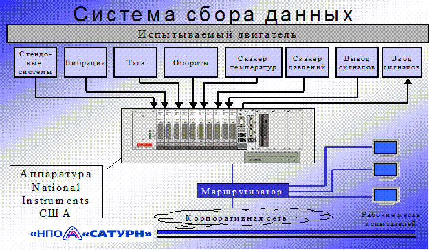 В области автоматизации испытаний в настоящее время выработан единый подход к построению автоматизированных систем измерений и контроля. Структурная схема измерительного комплекса приведена на рисунке. В состав системы обязательно входит станция сбора данных. Процесс сбора данных и выдача управляющих воздействий на объект испытаний выполняется на уровне этой станции. Обработка информации по технологии, визуализация, протоколирование и интерфейс с пользователями выполняется на уровне автоматизированных рабочих мест (АРМ). На этапе автоматизации в качестве устройств сбора данных используются различные аппаратно-программные комплексы. Данные комплексы по своим характеристикам должны удовлетворять требованиям к точности, быстродействию и масштабируемости (модульности) системы сбора данных. При автоматизации опытных испытаний, число измерительных каналов достигает 2000 и более. Программное обеспечение комплексов должно быть адаптивно для мониторинга большого числа параметров и подключения новых каналов, но не быть достаточно сложно и закрыто при необходимости изменения технологии испытаний. Для исследовательских испытаний с последующей сложной математической обработкой данных, а также для испытаний современных авиационных изделий иностранного производства, наиболее предпочтительно использовать устройства сбора данных в стандарте VXI, который представляет собой стандарт на контрольно-измерительную и управляющую аппаратуру высшего класса точности. Программное обеспечение, поддерживающее аппаратуру в этом стандарте, имеет высокую степень унификации. Прогрессивные инструментальные среды Lab VIEW, LabWINDOWS, Bridge VIEW, HP VEE позволяют быстро разрабатывать приложения сложной обработки данных на уровне технолога и расчетчика. АРМ бригадира-испытателя также является обязательным в составе автоматизированной системы. Именно на нем ведется управление техпроцессом испытаний. В составе системы может присутствовать АРМ контролера. Основное назначение – проверка соответствия параметров двигателя требуемым нормам со стороны бюро технического контроля. АРМ бригадира и контролера находятся непосредственно на испытательном стенде и получают информацию в реальном темпе испытаний с устройства сбора данных через сетевой интерфейс. Результаты испытаний в режиме реального времени поступают в единый корпоративный центр данных. Хранение результатов в едином центре обеспечивает: - гарантированное сохранение данных в соответствии с жесткими правилами отказоустойчивости и катастрофоустойчивости; - гарантированную защиту данных от несанкционированного использования, изменения и уничтожения; - авторизованный доступ к данным различным категориям пользователей; - высокую скорость работы приложений (программ анализа данных) с использованием технологии «клиент – сервер»; - работу всех пользователей с единым электронным документом. Все пользователи данных испытаний получают информацию посредством корпоративной вычислительной сети. При этом обработка данных осуществляется на мощных корпоративных серверах, а по сети передаются только результаты обработки. В состав автоматизированной системы включены следующие АРМы: - АРМ заказчика. Представители заказчика могут, находясь в своем помещении, следить за ходом испытаний 