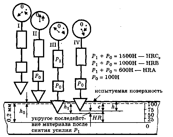 Последовательность операций при изменении твердости на твердомере Роквелла приведена на рис.3. 1. Включить прибор и установить деталь (образец) на столик. Стрелки индикатора прибора находятся в произвольном положении. 2. Подвести деталь к наконечнику с помощью телескопического подъемника таким образом, чтобы, указатель маленькой стрелки индикатора совместился с красной точкой на его циферблате. На образец действует сила вдавливания Р 0 = 100 Н., индентор внедряется на глубину h 0. Поворотом внешнего кольца индикатора устанавливаем нулевое деление шкалы С подвижного циферблата напротив указателя большой стрелки. Прибор готов к измерению твердости. .