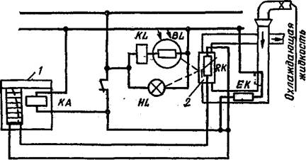 Рассмотрим принципиальную схему автоматического гигрометра с фотоэлектрическим индикатором появления конденсата (рисунок 2.4). В приборе установлен полый полированный цилиндр 2 из нержавеющей стали, который служит для наблюдения точки росы. Цилиндр помещен в среду газа, влажность которого измеряется. Через внутреннюю полость цилиндра непрерывно протекает охлаждающая жидкость, температуру которой можно регулировать электрическим нагревателем ЕК. Включается электрический нагреватель от электромагнитного реле KL, по обмотке которого протекает фототок фотоэлемента BL. Фотоэлемент освещается отраженным от зеркальной поверхности цилиндра 2 световым потоком лампы накаливания HL. Если температура зеркала, то есть стенок цилиндра 2, понижается до точки росы, то появляющийся на поверхности зеркала туман уменьшает световой поток, падающий на фотоэлемент. Фототек уменьшается (примерно в 2 раза) и реле срабатывает, замыкая цепь нагревателя ЕК. Температура охлаждающей жидкости повышается через некоторый промежуток времени выше точки росы, туман на зеркальце исчезает, фототок возрастает и реле выключает нагреватель, после чего снова зеркало охлаждается до точки росы и т. д. Таким образом, температура зеркального цилиндра непрерывно колеблется около точки росы; соответствующим выбором теплоемкости цилиндра 5 и расхода охлаждающей жидкости, а также мощности нагревателя можно сделать колебания температуры цилиндра 5 достаточно малыми. Внутри цилиндра в хорошем тепловом контакте с его стенками помещен термопреобразователь RK (или термопара), измеряющий температуру цилиндра, то есть точку росы. Указателем является самопишущий прибор 1 с точечной записью (с падающей дугой). Реле 2, управляющее перемещением (падением) дуги, в свою очередь, управляется реле 3, чем достигается синхронизация записи с моментом появления тумана. По аналогичной схеме построены другие автоматические гигрометры точки росы с различными способами нагрева и охлаждения зеркальца. Date: 2015-07-23; view: 981; Нарушение авторских прав |