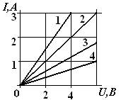 1. Через лампу, подключенную к источнику тока с ЭДС равной 8В и внутренним сопротивлением 0,5 Ом, протекает ток 2А. Зависимость тока от приложенного к лампе напряжения показано на графике. а) 4; б) 3; в) 1; г) 2.