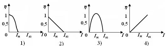 11. На каком из графиков верно представлена зависимость КПД источника тока η от силы тока I?