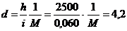 Необходимо провести трассу, предельный продольный уклон, которой не превышает i=60‰. Используя масштаб карты (1:10000) и высоту сечения рельефа (h=2,5 м), определим величину заложения для предельного уклона: