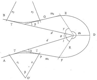 Расчет симметричной серпантины При расчете серпантина обычно задаются радиусом основной кривой R, радиусами вспомогательных кривых r, а также величинами прямых вставок. Основные элементы (β, d, γ, φ0), необходимые для разбивки серпантина на местности, вычисляют. Угол поворота вспомогательной кривой β находится по формуле: