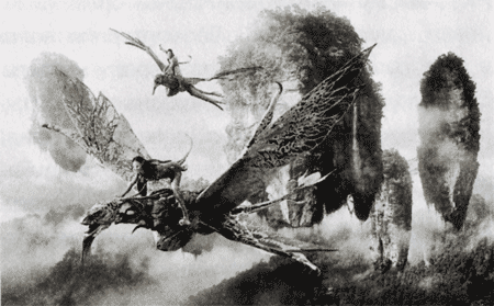 Джейк оглянулся — над ним нависал огромный баньши. Животное смотрело ему прямо в глаза и шипело. Джейк тут же начал раскручивать над головой бола: это был тот самый баньши. Он почувствовал это сердцем, как и предсказывала Нейтири. — Потанцуем? — предложил Джейк. Икран оскалил свои страшные зубы. Джейк рванулся прямо к нему и точно в нужный момент кинул свой снаряд. Бола дважды обернулось вокруг морды животного, не давая ему разомкнуть челюсти. Джейк вскочил на спину разъярённого икрана. Тот зацепил Джейка когтями, но ему удалось обхватить руками шею баньши. Икран изо всех сил старался сбросить наездника — Джейк чувствовал себя так, будто объезжает норовистого быка на родео. Он знал, что нужно как можно скорее установить связь. Оставалось всего несколько секунд до того, как баньши избавится от бола и сбросит Джейка на землю. Он дотянулся до длинной, хлещущей из стороны в сторону антенны, но в этот момент икран скинул его и Джейк покатился по скользкой земле к краю пропасти! У самого края Джейк ухватился за корни и подтянулся наверх. Не успев перевести дыхание, он снова бросился к брыкающемуся животному. Нейтири закричала: — Цахейлу, Джейк! Ты должен установить связь! Джейк слышал, как Цу’тэй смеётся и говорит другим охотникам, что тот скоро умрёт. Но поединок ещё не закончился! Стараясь выпрямиться на спине икрана, Джейк перекинул вперёд свою косу и схватил антенну животного. В последнюю секунду ему всё-таки удалось соединить их. Почти сразу животное успокоилось. Джейк жадно хватал ртом воздух, постепенно приходя в себя. — Вот так-то лучше! — заявил он икрану. — Теперь ты мой! Нейтири подбежала к нему, радостно улыбаясь. — Первый полёт укрепит связь. Нельзя медлить! Джейк поудобнее уселся на спине икрана, всё ещё тяжело дыша. Он крепко ухватился за основания антенн. — Йя-хуу! — закричал он, давая икрану команду подняться в воздух. Тот расправил крылья и полетел. Соскользнув с обрыва, они нырнули вниз. Отчаянные крики Джейка и икрана слились в один, когда они закружились по спирали, всё убыстряя падение. Они несколько раз ударились о скалы и пронеслись сквозь водопад, прежде чем Джейк наконец сообразил, что нужно сконцентрироваться и указать животному, куда лететь. — Заткнись! — раздражённо крикнул Джейк. — Выровняйся и лети прямо! — скомандовал он. Животное успокоилось и, к удивлению Джейка, чётко выполнило команду. Теперь он вспомнил всё, чему его учили, но это действительно был совсем не лютоконь! — Вираж влево! — отдал мысленный приказ Джейк. Икран подчинился, размеренно взмахивая крыльями. Джейк почувствовал, что полёт — это именно то, ради чего он родился! К ним присоединилась Нейтири на своём икране, и Джейк полетел за ней, снова становясь послушным учеником. В то время как Нейтири летела ровно и уверенно, икран Джейка, ещё не привыкший к своему наезднику, то и дело вихлял и нырял вниз.