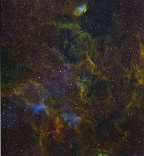 Небесные звезды зарождаются внутри гигантских облаков материи, которые называют туманностями. На этой фотографии – две такие туманности. Та, что справа (зелено‑оранжевая), находится от нас на расстоянии 9000 световых лет. Та, что слева (синяя), – еще дальше, на расстоянии 20000 световых лет. Иными словами, свет, излучаемый туманностью справа, прежде чем попасть в объектив фотоаппарата, двигался 9000 лет, а свет, испускаемый туманностью слева, – 20000 лет. Столько времени ему потребовалось, чтобы достигнуть Земли. В центре этих туманностей можно различить розовый или голубоватый свет совсем молодых звезд.