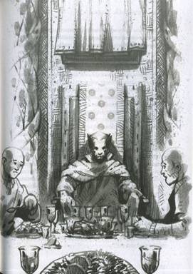 Стоя за своими стульями вокруг накрытого стола, гости оживленно беседовали в ожидании короля. На длинном, тянувшемся через весь зал столе сверкали хрустальные бокалы, белоснежные фарфоровые тарелки и золотые приборы. Стены были украшены портретами родоначальников королевской династии. Мажордом проводил Миртиль к ее месту в центре стола, между двумя снегобоями в плащах с уже знакомой вышивкой – снежными облаками. Среди гостей попадались и другие военные, но большинство были в цивильных костюмах. «Губернаторы…» – подумала Миртиль. Ей показалось, что все эти господа и дамы, оказавшиеся вдали от своих облаков и, главное, от своих армий, чувствовали себя неуверенно и ожидали появления короля со страхом. Во главе стола на возвышении стоял трон с высокой спинкой, украшенной королевскими гербами. На стене над троном висела большая картина, почти целиком скрытая пурпурным занавесом. Появления Миртиль, судя по всему, не заметил никто, кроме одной на редкость полной дамы, которая выделялась своей прической из нескольких наложенных друг на друга шиньонов в форме облаков. Дама эта с удивлением посмотрела на пыльные и растрепанные волосы девочки. Ударил гонг, и все замолчали. В зал вошел мужчина. Гости склонились в глубоком поклоне. Мужнина в белых одеждах, с наброшенным на плечи черным шелковым плащом направился к трону и сел. У него были красивые темные волосы, изящная ухоженная бородка и элегантные манеры. И держался он с поистине королевским достоинством. Этому человеку нельзя отказать в своеобразном обаянии, подумала Миртиль, но с удивлением отметила одну странность – он казался и могущественным и бессильным, и счастливым и отчаявшимся, словно не мог сделать выбор в пользу какого‑то определенного состояния и потому переживал их все одновременно.