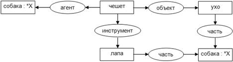 [собака: *X] – <– (агент) <– [чешет] – –> (объект) –> [ухо] –> (инструмент) –> [лапа] <– (часть) – <– [ухо] <– [лапа].