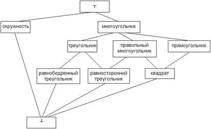 Как отмечено ранее, база знаний представляет собой набор концептуальных графов. Каждый отдельный граф представляет собой один факт (высказывание, правило) из предметной области, описываемый через ассоциативные отношения между понятиями. Для представления второго базового механизма структурирования знаний – обобщения понятий – в теории концептуальных графов используются иерархии типов. Отдельная иерархия представляется в виде решетки, описывающей таксономические отношения (отношения наследования) между понятиями, включая множественное наследование. Для представления иерархии типов в виде решетки в нее включается два специальных типа: 1. универсальный тип (англ. universal type), являющийся супертипом для всех типов. Обозначается символом «┬»; 2. абсурдный тип (англ. absurd type), являющийся подтипом для всех типов. Обозначается символом «┴». На рисунке 7 приведен пример иерархии типов.