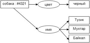 Рисунок 4 – Пример концептуального графа Авторы первых семантических сетей не уделяли должного внимания к четкому семантическому разделению отношений вида «класс - подкласс» («множество» - «подможество») и «класс» - «экземпляр» («множество» - «элемент»). Например, отношения, характеризующие свойства и поведение класса («млекопитающие»), могут отличаться от отношений подкласса («собака»), также как отношения подкласса («собака») от отношений конкретного экземпляра («Тузик»). Графического или символьного выделения таксономии (иерархии) понятий в семантических графах не предусмотрено. В концептуальных графах внутри вершины, обозначающей понятие, можно указывать имена его типа и экземпляра (разновидности типа). Например, «персона: Маша», «млекопитающее: собака» или «собака: Тузик». При описании конкретных, но неименованных (анонимных) экземпляров, используется маркер «#». Например, «персона: #1234» или «собака: #4321». Использование анонимных экземпляров позволяет упростить описание и представление предметной области (базы знаний), как набора концептуальных графов. В частности, факт, что три собаки «Тузик», «Мухтар» и «Байкал» черного цвета можно описать вместо одного графа двумя (рисунок 5).