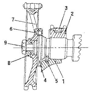 » Открутить за несколько этапов болты крышек подшипников распределительного вала и снять крышки по очереди. Крышки помечены номерами в местах, показанных на рисунке (стрелки). На рисунке показан 4-цилиндровый двигатель, однако, рассматриваемые здесь другие двигатели подобны. » Вынуть распределительный вал вверх. » Вынуть крепление распределительного вала из головки блока цилиндров. На рисунке показан поперечный разрез конца распределительного вала с расположением креплений Эти полукруглые шайбы (полушайбы) ограничивают осевое перемещение распределительного вала.