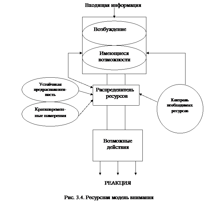 Рис. 3.3. Модель уместности Дойчей-Нормана Модель уместности (термин «уместность» предложил сам Д. Норман) кажется несколько неэкономичной, большое количество несущественных стимулов проверяется, прежде чем начнется их дальнейшая обработка. По Д. Норманну, сенсорные входные сигналы подвергаются параллельной обработке. Предпочтение отдается сигналам в зависимости от их существенности или «уместности» по отношению к текущей цели, стоящей перед системой. Итак, опознаются все элементы, все сигналы находят соответствие в памяти, где происходит некоторый минимальный анализ их значения. Затем запускается механизм избирательного внимания. Путь сенсорных сигналов Д. Норманн описывает следующим образом: «Все сигналы, поступающие на органы чувств, проходят стадию анализа, осуществляемого сначала физиологическими процессами. На основе выделенных параметров определяется место, где хранится репрезентация данного сенсорного сигнала. Все сенсорные сигналы возбуждают свои репрезентации, а в это же самое время продолжается анализ предыдущих сигналов. Так формируется класс событий, которые следует считать уместными по отношению к текущему анализу. Этот набор уместных элементов также активизирует в памяти свои репрезентации. Элемент, который возбуждается в наибольшей степени совместным действием уместных и сенсорных входных сигналов, отбирается для последующего анализа» (Цит. по: Солсо, 1996; С. 128). Модели внимания с ограниченными возможностями Лауреат Нобелевской премии Дэниел Канеман в 1973 г. предложил концепцию внимания как умственного усилия (ресурсную модель внимания). Он исходил из того, что значение имеет не столько расположение фильтра («узкого места»), а сам процесс обработки информации. При этом задействован не ограничительный канал, а распределитель ресурсов, который контролирует процесс распределения возможностей. В оптимальных условиях человек способен одновременно выполнять более чем одно задание. Однако несколько сложных раздражителей могут быстро истощить все ресурсы, и на обработку дополнительных раздражителей или на обратную связь внимания просто не хватит. Ресурсную модель внимания Д. Канемана принято рассматривать как начало разработки так называемых теорий внимания «второго поколения» Итак, согласно модели Д. Канемана, входящая информация вызывает определенное возбуждение. В результате имеющиеся возможности (ресурсы) приводятся в соответствие со стимулом в зависимости от устойчивой или ситуационной предрасположенности. Устойчивая предрасположенность – это приоритетное переключение внимания на громкие звуки, вспышки света, на звук своего имени. Ситуационная предрасположенность – кратковременное намерение. Их взаимодействие изучал Д. Андерсон с коллегами (Anderson et al., 1987) на примере инертности внимания у детей, которые смотрят телевизионные программы. Кратковременное намерение (просмотр телепередачи) влияет на распределение ресурсов внимания, поэтому для устойчивой предрасположенности (отвлекающий источник) их остается меньше. Если бы отвлекающим сигналом был, например, громкий удар, то сначала повысился бы уровень возбуждения, а затем была бы активирована устойчивая предрасположенность.
