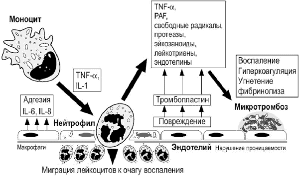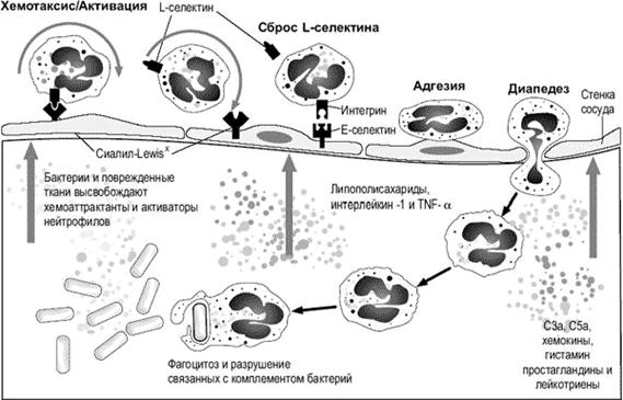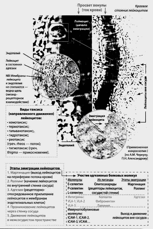 Рис. 5. Эмиграция лейкоцитов в очаге воспаления (В. Войнов 2007)