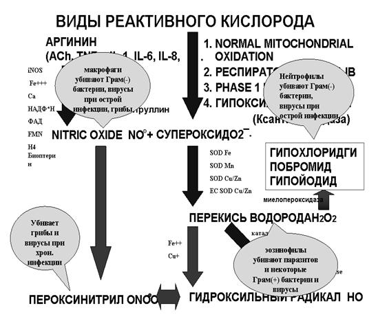Макрофаги. Образуются из моноцитов в тканях. Участвуют в фагоцитозе. Синтезируют целый ряд БАВ: эстеразы, протеазы и антипротеазы; лизосомальные гидролазы — коллагеназа, эластаза, лизоцим, α-макроглобулин; монокины — ИЛ-1, колониестимулирующий фактор, фактор, стимулирующий рост фибробластов; антиинфекционные агенты — интерферон, трансферрин, транскобаламин; компоненты комплемента: С1, С2, СЗ, С4, С5, С6; дериваты арахидоновой кислоты: простагландин Е2, тромбоксан А2, лейкотриены. Активированные макрофаги синтезируют и свыделяют интерлейкин-1 (ИЛ-1). Он находит свои мишени (миоциты, синовиоциты, гепатоциты, костные клетки, лимфоциты, нейроциты). На мембранах этих клеток имеются специфические рецепторы, благодаря которым ИЛ-1 действует именно на них, а не на другие клетки. Действие ИЛ-1 универсально, т.е. срабатывает при любом инфекционном (воспалительном) заболевании, причем в самом начале, и таким образом дает сигнал указанным органам включиться в воспалительный (инфекционный) процесс. Характерные для ранних этапов заболевания симптомы (головная боль, боль в мышцах и суставах, сонливость, лихорадка, лейкоцитоз и увеличение содержания белков, в том числе иммуноглобулинов) объясняется именно действием ИЛ-1. Стимулируют функцию макрофагов (моноцитов): Mg, Zn, P5P, малат, Бета каротин, В5, фолиновая кислота, вит.С, НАДН, масло печени акулы, карнитин, глютамин, сныть, астрагал, кошачий коготь. эхинацея, женьшень, желтокорень канадский, солодка, кукурма, мирра. Угнетают: табак, Cu, Р5Р, SAM, глютатион, ацетил коэнзим А, глюкуроновая кислота, сера. Нейтрофилы. Главная функция этих клеток — фагоцитоз. Из костного мозга они выделяются в кровь, эмигрируют из сосудов и в больших количествах скапливаются в воспаленной ткани. Их активное их размножение, и миграция, и фагоцитоз подвержены регулирующему влиянию БАВ. Действие их проявляется, только тогда, когда на клетках имеются рецепторы, специфически реагирующие с медиатором воспаления: гистамином, адреналином, глюкокортикоидами, гамма-глобулинами и т.д.В цитоплазме нейтрофилов имеется два типа гранул: первичные азурофильные (более крупные) — обычные лизосомы, вторичные, или специфические гранулы мельче содержащие: щелочную фосфатазу, лизоцим, лактоферрин, а также глюкозамингликаны и белки катионовой природы; в них не содержится кислых гидролаз. В первичных гранулах содержатся кислые гидролазы, лизоцим, миелопероксидаза и катионные белки. Нейтрофилы, после выполнения своей функции погибают. Они образуются из стволовых клеток — миелобластов в результате процесса прогрессирующей пролиферации (продолжительность 6 сут) и последующего процесса созревания (продолжительность тоже 6 сут), в ходе которого клетка лишается практически всех органелл. В костном мозге образуется депо нейтрофилов. Из костного мозга они выходят в кровоток. Из крови они поступают в ткани или фиксируются на поверхности кровеносных сосудов (соотношение 1:1). Полупериод их нахождения в крови—6—7 ч. Свои функции они осуществляют в тканях, где переживают еще около двух дней, а потом погибают.