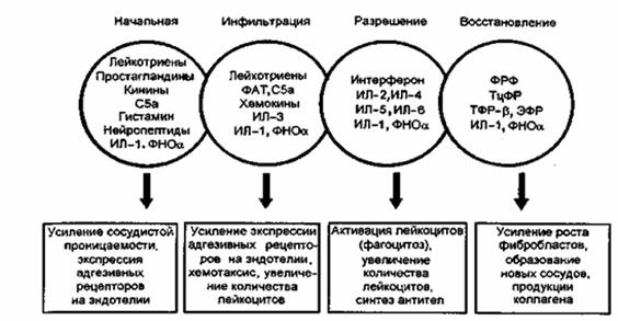 Рис. 14. Роль медиаторов воспаления на разных стадиях процесса.