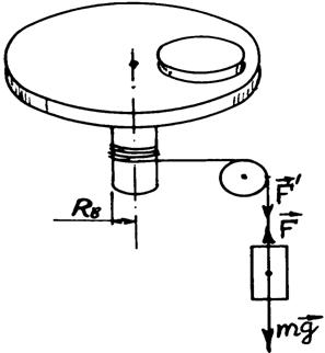 Для визначення моменту інерції будь-якого тіла правильної геометричної форми в наведеній формулі відстані від осі обертання до його матеріальних точок позначають літерою х, а маси точок – dm та інтегрують. Моменти інерції тіл неправильної геометричної форми знаходять експериментально. Пристрій для визначення моменту інерції тіла неправильної форми являє собою металевий диск, який має можливість обертатися навколо нерухомої вертикальної осі під дією вантажу, що падає, масою m (рис. 8.1). Вантаж у вигляді гирі підвішується до нитки, другий кінець якої закріплено на валу. Вал обертається разом с диском, на якому розміщується тіло неправильної форми. Момент інерції тіла I можна знайти за основним законом динаміки обертального руху (8.3):