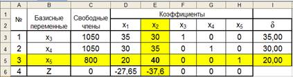 2. Поделим элементы столбца значений базисных переменных (свободных членов), не считая последней строки, на соответствующие положительные коэффициенты выбранного столбца: 1050/30 = 35, 1050/35 = 30, 800/40 = 20. Запишем частные от деления во вспомогательный столбец δ (табл. 4).