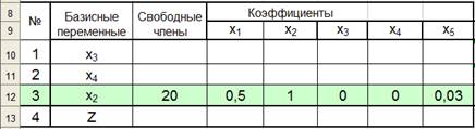 Переменные x 3, x 4, x 5 – базисные, x 1, x 2 – небазисные (свободные). Положив x 1= x 2= 0, получим значения базисных переменных: x 3= 1050, x 4= 1050, x 5 = 800.