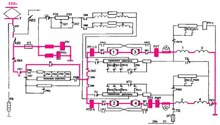 1) Реостатное регулирование скорости производится за счёт выведения ступеней пусковых реостатов групповым реостатным контроллером под контролем РУТ. Поз. «Х1» Ток уставки РУТ - 100А; Поз. «Х2» Ток уставки РУТ -160А. 2). При завершение выведения ступеней пусковых реостатов производится их полное шунтирование контактором Р и отключение контактором Ш шунтовых обмоток возбуждения. При этом тяговые двигатели выходят на автоматическую характеристику последовательного возбуждения. Тяговые двигатели подключены к контактной цепи линейными контакторами при полностью выведенных пусковых реостатах и работаю в магнитном поле возбуждении только сериесных обмоток.