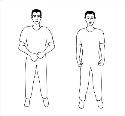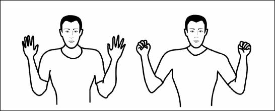 Рис. 20. Упражнение «Ладошки» Количество повторений: подряд делаем 4 резких, ритмичных вдоха носом. Затем руки опускаем и отдыхаем 3–4 секунды – пауза. Еще 4 вдоха – пауза. Всего 24 раза по 4 вдоха. Примечание: в начале урока [38] возможно появление легкого головокружения. Это не повод прекратить выполнение комплекса: к концу занятий оно пройдет. Если головокружение сильное, садимся и выполняем весь урок сидя, делая более длинные паузы после каждых 4 вдохов‑движений (пауза может быть и 5, и 10 секунд). Упражнение 2. «Погончики»