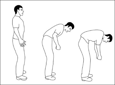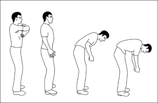 Рис. 22. Упражнение «Насос» Исходное положение: встать прямо, стопы параллельны, расстояние между ними чуть уже ширины плеч, руки вдоль туловища. Выполнение упражнения: делаем легкий поклон (руки тянутся к полу, но не касаются его) и одновременно – шумный и короткий вдох носом во второй половине поклона. Вдох должен завершиться вместе с поклоном. Слегка приподнимаемся (но не выпрямляемся), снова поклон и короткий шумный вдох «с пола». Поклоны выполняются ритмично и легко, низко не кланяйтесь, достаточно поклона в пояс. Спина круглая (не прямая!), голова опущена. Это движение имитирует работу с ручным автомобильным насосом – отсюда и название. Количество повторений: 12 раз по 8 вдохов‑движений. Примечание: на исполнение этого упражнения накладывают ограничения травмы головы и позвоночника, многолетние радикулиты; повышенное артериальное, внутричерепное и внутриглазное давления; камни в печени, почках и мочевом пузыре. При всех этих состояниях нельзя наклоняться низко. Упражнение 4. «Кошка»