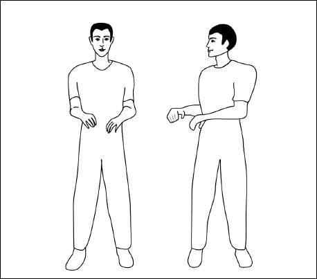 Рис. 24. Упражнение «Обними плечи» Исходное положение: встать прямо, руки согнуты в локтях и подняты на уровень плеч. Выполнение упражнения: «бросаем» руки навстречу друг другу до отказа, как бы обнимая себя за плечи. Одновременно с каждым «объятием» делаем резкий вдох носом. Руки в момент «объятия» движутся параллельно друг другу (а не крест‑накрест), ни в коем случае нельзя их менять (при этом все равно, какая рука сверху – правая или левая), широко разводить в стороны и напрягать. Количество повторений: 12 раз по 8 вдохов‑движений. Примечание: больным ишемической болезнью сердца, с врожденными пороками, перенесенным инфарктом в первую неделютренировок не делать упражнение «Обними плечи». Начинать его выполнять нужно со второй недели. Женщинам, начиная с шестого месяца беременности, выполняя упражнение «Обними плечи», голову назад не откидывать, двигать только руками, стоя ровно и смотря прямо перед собой. Упражнение 6. «Большой маятник»