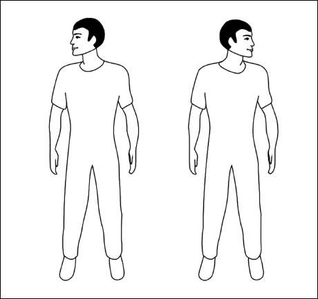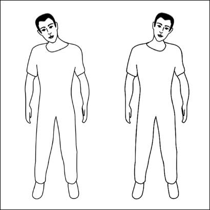 Рис. 26. Упражнение «Повороты головы» Выполнение упражнения: повернуть голову вправо – шумный, короткий вдох носом с правой стороны. Затем повернуть голову влево – шумный, короткий вдох носом с левой стороны. Вдох справа – вдох слева. Посередине голову не останавливать, шею не напрягать, вдох не тянуть! Количество повторений: 12 раз по 8 вдохов‑движений. Упражнение 8. «Ушки» Исходное положение: встать прямо, стопы параллельны, расстояние между ними чуть уже ширины плеч, руки вдоль туловища. Выполнение упражнения: наклоняем голову вправо, правое ухо идет к правому плечу – шумный, короткий вдох носом. Затем наклон головы влево, левое ухо идет клевому плечу– вдох. Упражнение при непрерывном повторении напоминает движения «китайского болванчика».