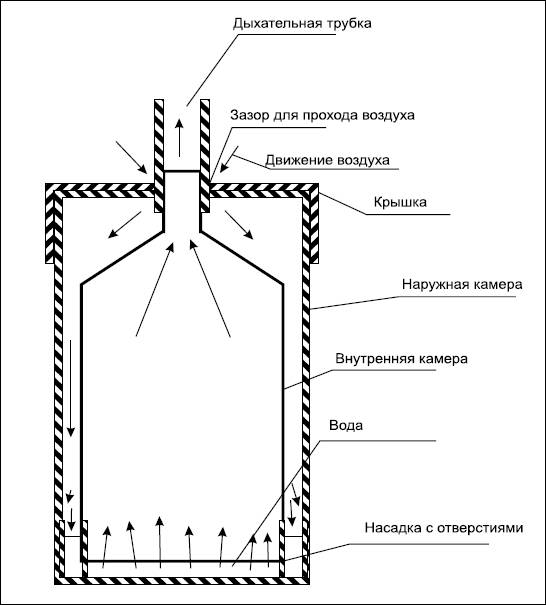 В 1999 году в Новосибирске была выпущена книга В.Ф. Фролова с громким заглавием «Эндогенное дыхание – медицина третьего тысячелетия». Тысячелетие началось, однако эндогенное дыхание еще не заменило собой других видов терапии. Для тех, кто не в курсе: Владимир Фролов – создатель «Дыхательного тренажера Фролова», продающегося сотнями тысяч штук в год. Откуда такой коммерческий успех? Маленькая предыстория В 1989 году в «Международном банке идей» была зарегистрирована новая гипотеза о процессах дыхания. Автор гипотезы– врач Г.Н. Петракович. Гипотеза основана на пересмотре роли легочного сурфактанта в процессе дыхания. Традиционно считается, что сурфактант – это поверхностно‑активное вещество (ПАВ), облегчающее диффузию газов и их проникновение через гема‑то‑альвеолярный барьер. Согласно же новой теории в альвеолах легких атмосферный кислород используется для окисления сурфактанта. При этом взаимодействие кислорода и сурфактанта осуществляется по принципу горения, что сопровождается электронными выбросами, а эритроциты передают клеткам электронное возбуждение. Электронное возбуждение инициирует в мембранах клеток механизм свободно‑радикального окисления полиненасыщенных жирных кислот с образованием свободного кислорода, т. е. кислород образуется внутриклеточно. Развивая идеи Г.Н. Петраковича, К. П. Бутейко и метод нормобарической гипоксии, автором которого является московский профессор РВ. Стрелков, В.Ф. Фролов разработал теорию и методику, названную им эндогенным дыханием, и дыхательный тренажер ТДИ‑01. Согласно его определению, эндогенное дыхание – это процесс, когда в четком ритме, в резонансе работают самые многочисленные клетки организма – альвеолоциты, эритроциты, эндотелиоциты. Реализуется принцип эндогенного дыхания с помощью дыхательного тренажера Фролова – ТДИ‑01, который был разрешен к применению приказом Министерства здравоохранения РФ от 15.11.1995 г. № 311. Многие аспекты эндогенного дыхания связаны именно с этим устройством, поэтому о нем надо сказать несколько слов. Дыхательный тренажер ТДИ‑01 Назначение тренажера. ТДИ‑01 представляет собой оригинальное портативное устройство, предназначенное для дыхательных тренировок с целью профилактики и лечения различных заболеваний и повышения адаптационных возможностей организма человека. Устройство и принцип работы. Тренажер состоит из двух цилиндрических, входящих одна в другую и заливаемых жидкостью камер, непосредственно соединенных с дыхательной трубкой (рис. 28). Внутренняя камера снабжена насадкой с отверстиями, а ее горлышко соединено с дыхательной трубкой. Наружная камера снабжена крышкой. Внутреннее отверстие крышки образует с трубкой зазор для прохода воздуха. При сборке тренажер заправляется 20 мл обычной или дистиллированной воды или лекарственного раствора. ТДИ‑01 может использоваться в нескольких функциональных режимах: • в качестве ингалятора водорастворимых и масляных лекарственных средств; • для увлажнения вдыхаемого воздуха; • для создания сопротивления (положительного давления) в фазах вдоха и выдоха с целью тренировки диафрагмы и дыхательных мышц, а также предотвращения эффекта экспираторного закрытия дыхательных путей.