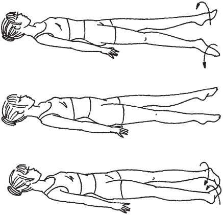 Рис. 6. Упражнение 8 9. Исходное положение: лежа на спине, руки вытянуты вдоль туловища, ноги выпрямлены и разведены на ширину плеч. Разверните правую ступню вправо, а левую – влево. Задержитесь в этой позиции на несколько секунд, затем вернитесь в исходное положение. Затем разверните левую ступню вправо, а правую влево и снова примите исходное положение (рис. 7). Количество повторов – 5–8.