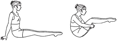 Рис. 11. Упражнение 13 14. Исходное положение: сидя на полу, упершись в него прямыми руками, ноги выпрямлены. Согните ноги в коленях, поднимите их над полом, обхватив руками. При этом старайтесь коснуться колен кончиком носа. Вернитесь в исходное положение (рис. 12), после чего повторите упражнение 5–10 раз.
