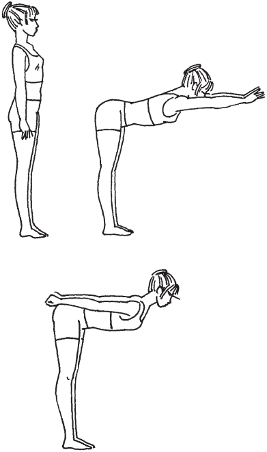 Рис. 34. Упражнение 6 7. Исходное положение: стоя, руки опущены вдоль туловища, пальцы сжаты в кулаки, ноги на ширине плеч. Наклонитесь вперед так, чтобы туловище оказалось параллельно полу, одновременно вытянув руки перед собой. Вернитесь в исходное положение. Затем сделайте еще один наклон вперед, одновременно отводя руки за спину (рис. 35). Количество повторов – 5–10.